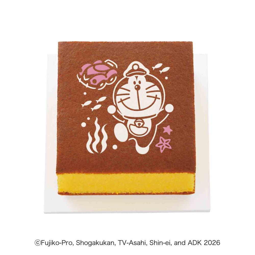 カステラの上のイラストも映画限定!ひみつ道具「カメレオンぼうし」を被ったドラえもんが楽しげにポーズを決めています。